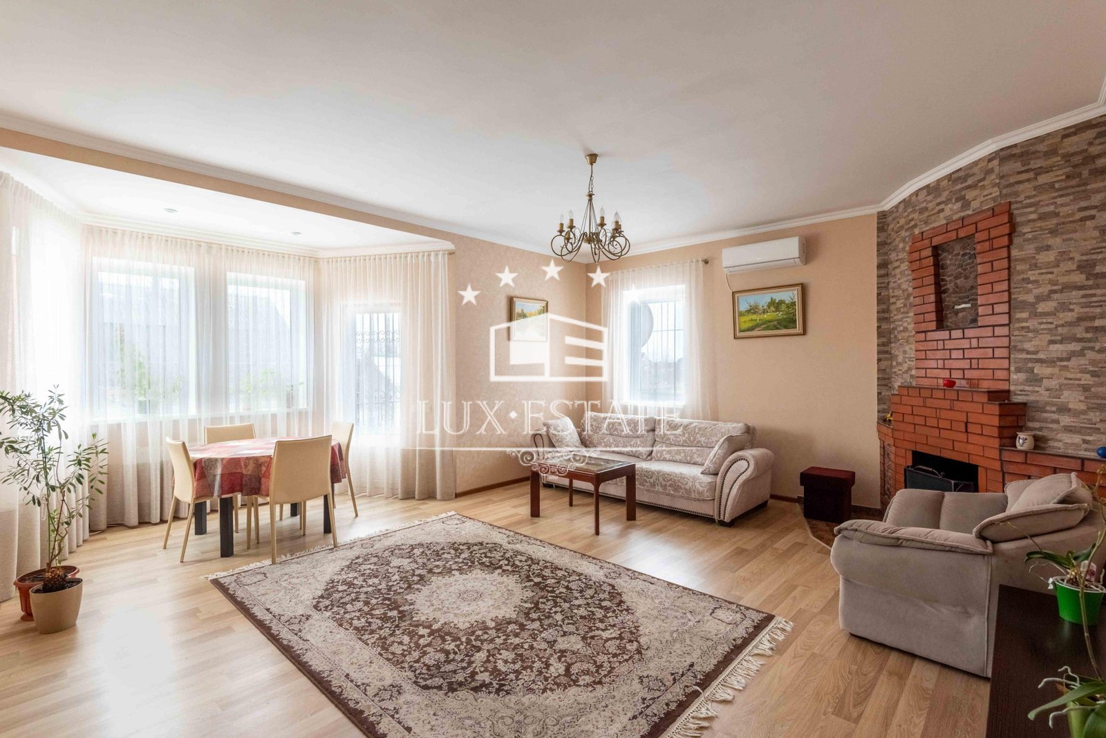 ДОМ Общая площадь -220 м.кв.: большая комната с камином, соединенная с кухней, большая комната отдыха, 4 отдельных спальни, 3 санузла, отдельное техническое помещение. Удачная планировка, светлые комнаты (высота потолка 3,20 м), удобная деревянная лестница. Стены из красного кирпича, железобетонные перекрытия, первый этаж с гидроизоляцией и утепленный. Крыша керамическая черепица, утепленная минеральной ватой 250 мм. Евроремонт всего дома (покраска, обои, плитка, ламинат, карнизы, сантехника, электричество). Отопление газовый котел+камин. Дополнительно установлен бойлер и два кондиционера.