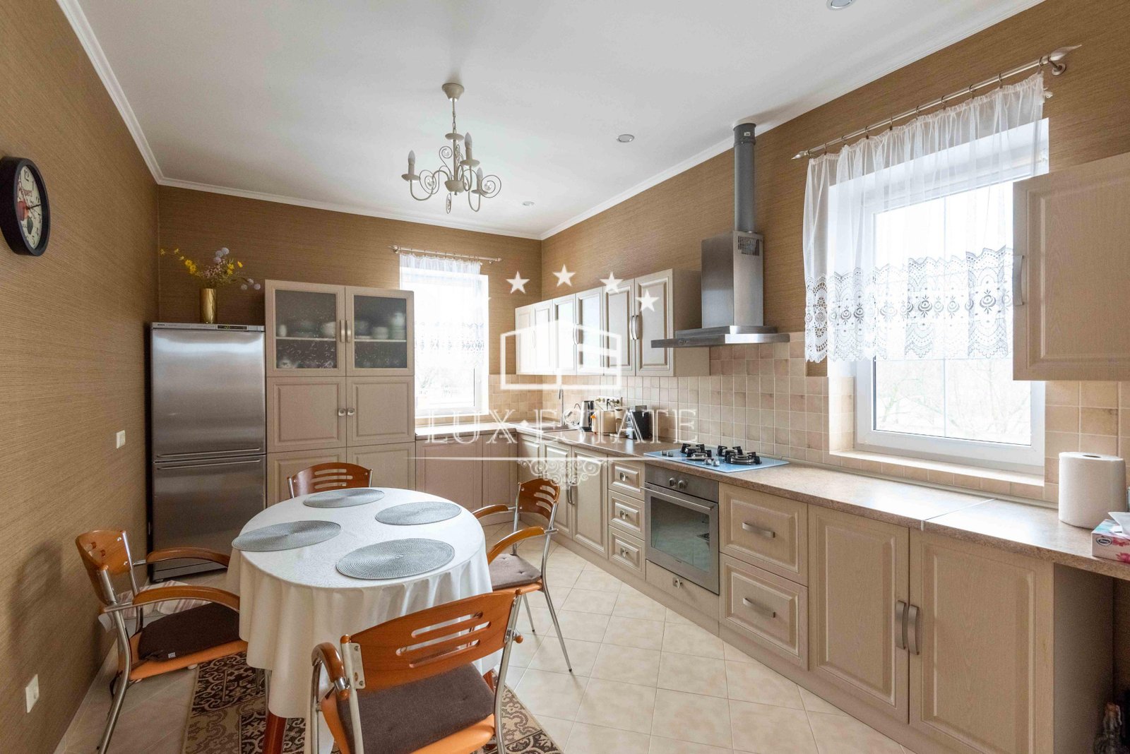 Дом полностью обставлен мебелью и бытовой техникой, готов к заселению – на фото видны детали. Техника, мебель, сантехника. пол, стены – все в идеальном состоянии.