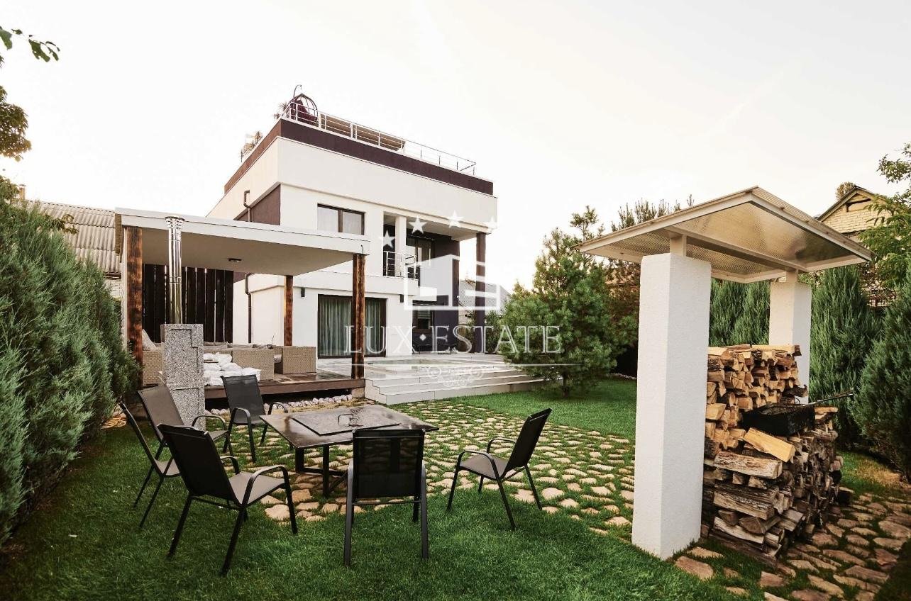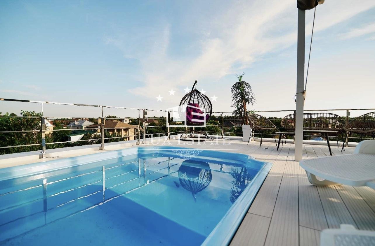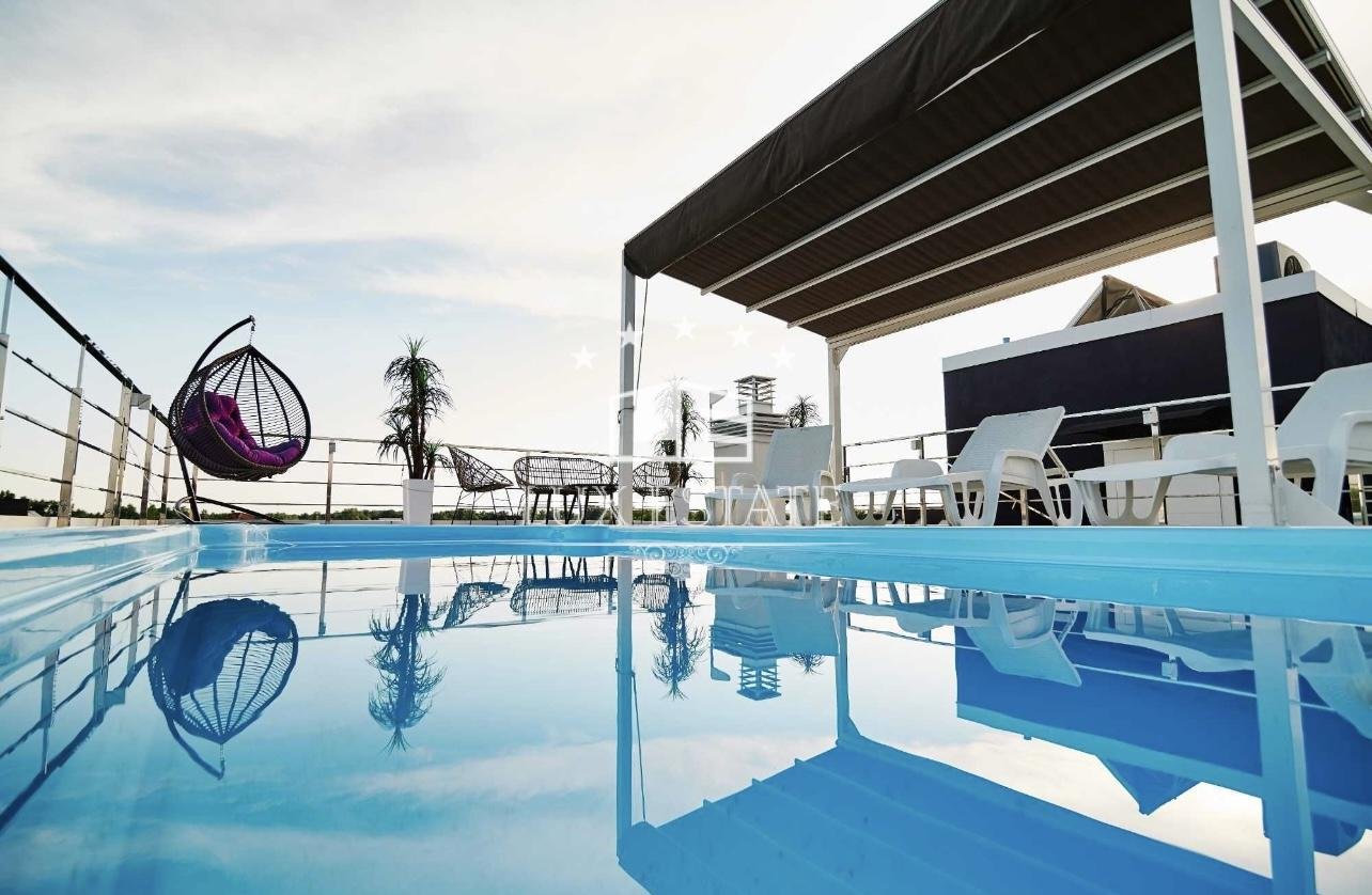 2. Эксклюзивная архитектура: Плоская эксплуатируемая кровля с бассейном (с подогревом) и зоной отдыха. Удивительный панорамный вид на Днепр и заповедную зону.