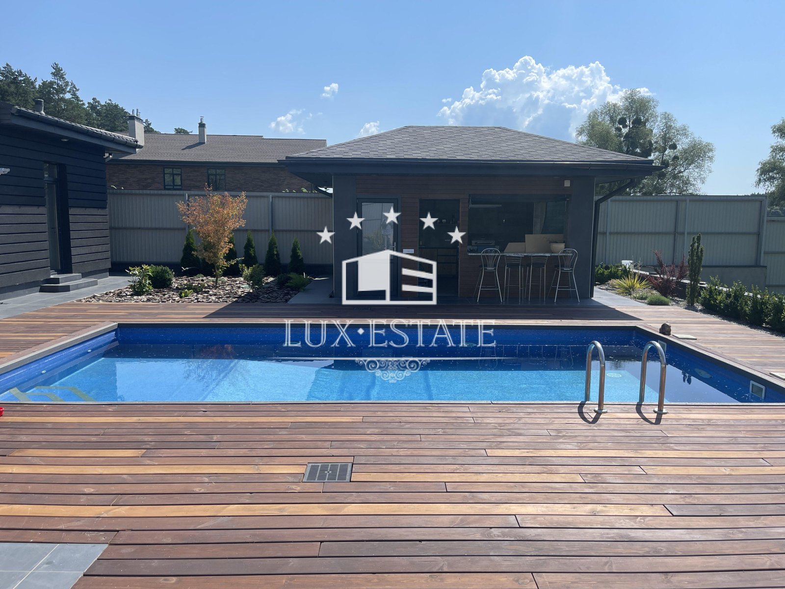 На территории есть беседка с барбекю, бассейн и ухоженный сад, где можно наслаждаться временем на свежем воздухе.